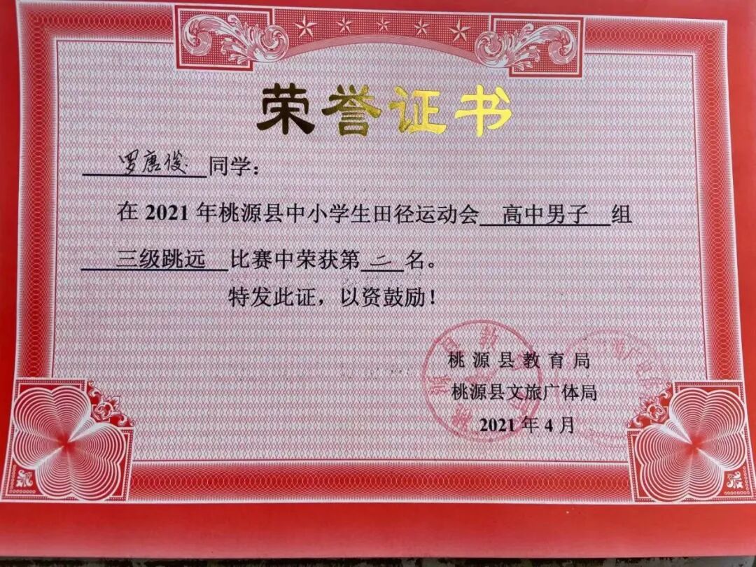 热烈祝贺我校罗唐俊同学在2021年桃源县中小学生田径运动会高中男子组三级跳远比赛中荣获第二名。